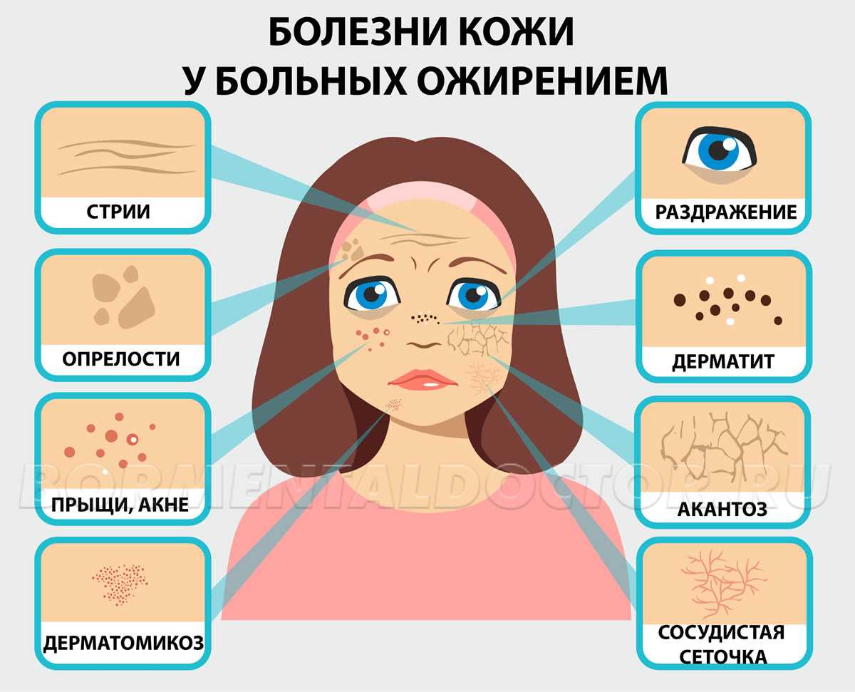 Людей с ожирением преследуют постоянные проблемы с кожей. Этот защитный покров организма страдает и от биохимических причин — нарушений эндокринных и метаболических процессов, и от причин механических — трения в области жировых складок, постоянно пребывающих в «атмосфере» влажности и повышенной жировой секреции. Вот лишь некоторые дерматологические «прелести», сопровождающие обладателей тучных фигур: